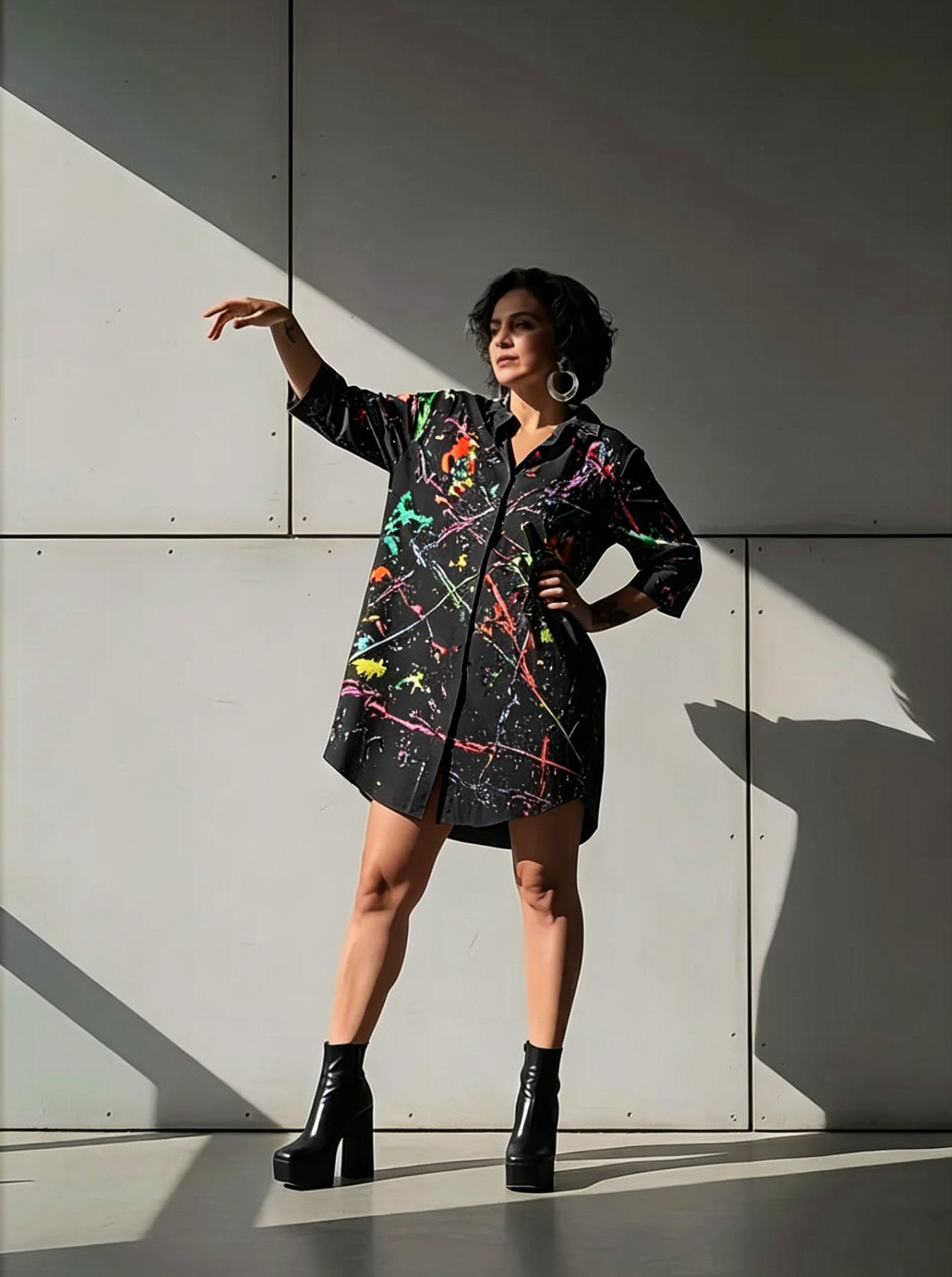 Vestido Chemise Viscose, manga 3/4, Pintura Abstrato.